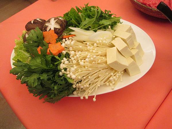 菜盤的部分則有豆腐、金針菇、大蔥、香菇、紅蘿蔔和多種青菜